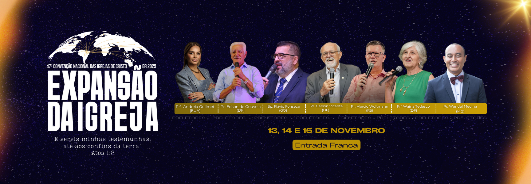 Preletores: Prª. Andreia Guilmet (EUA), Pr. Edson de Gouveia (DF), Bp. Flávio Fonseca (GO),Pr. Gerson Vicente (DF), Pr. Marcio Woltmann (RS), Prª Waina Tedesco (DF), Pr. Wendel Medina (MG)